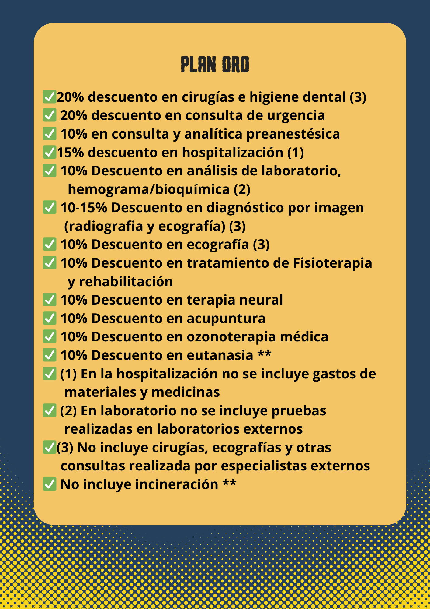 Con el Plan Oro, tu mascota accede a una cobertura superior y a una amplia gama de descuentos en servicios adicionales.